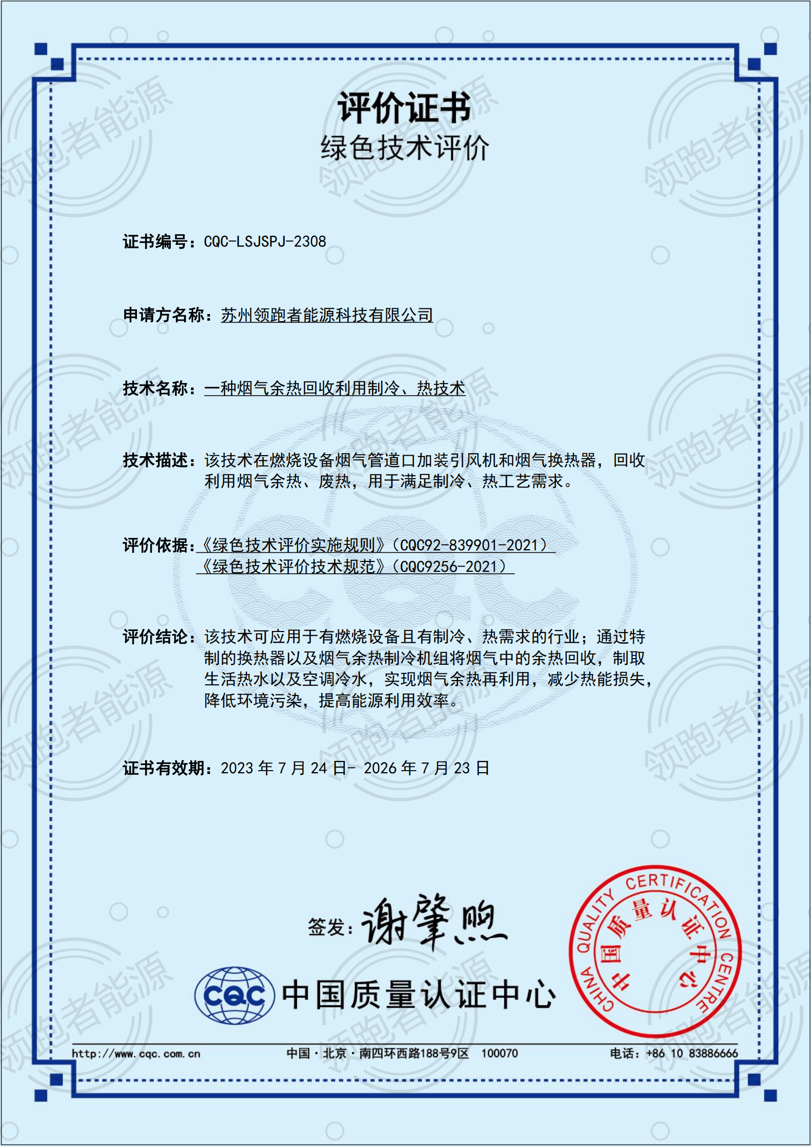 近日,蘇州領(lǐng)跑者能源科技有限公司榮獲由中國(guó)質(zhì)量認(rèn)證中心頒布的“一種煙氣余熱回收利用制冷、制熱技術(shù)”CQC綠色技術(shù)評(píng)價(jià)證書(shū)。CQC......